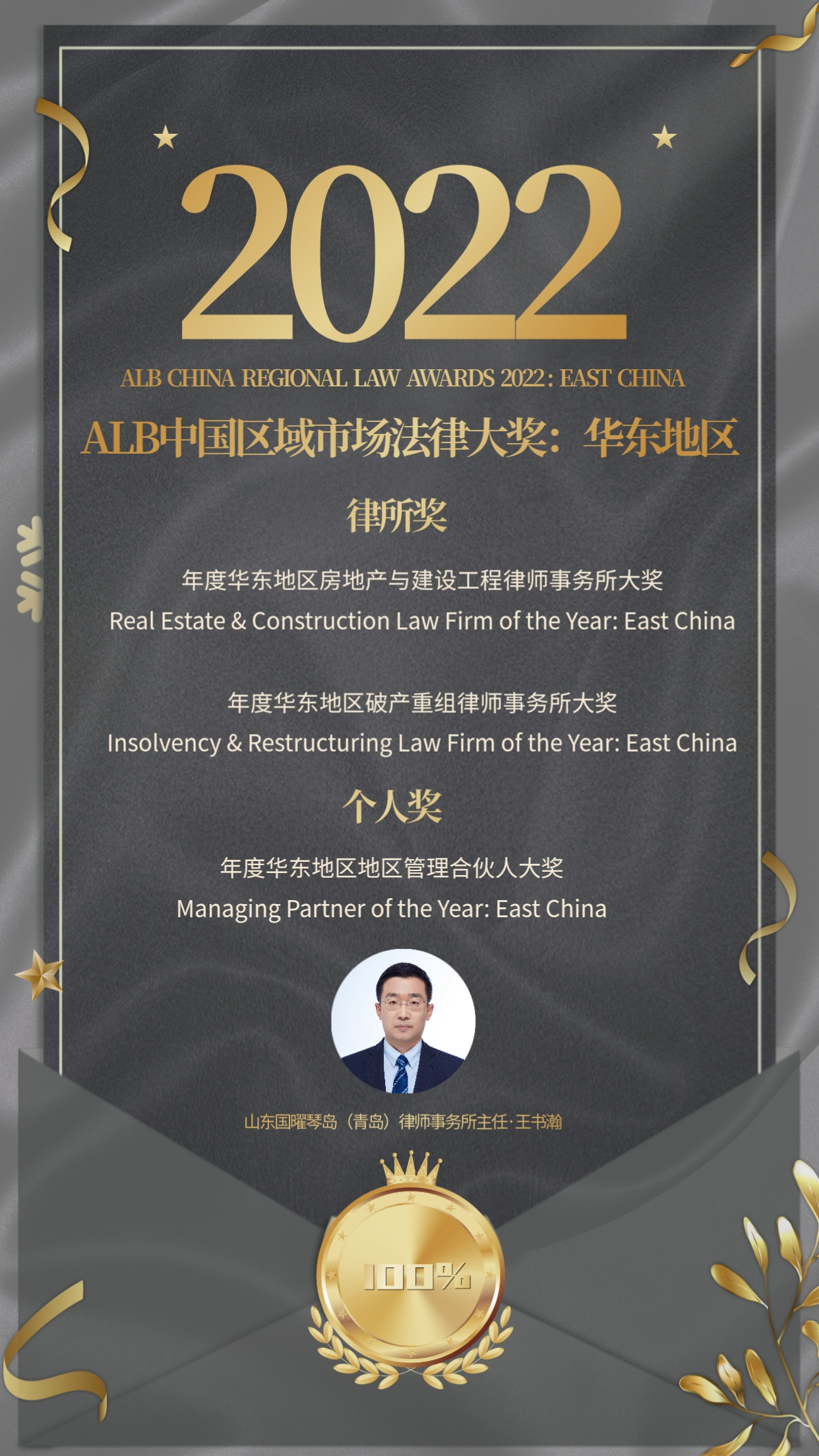 国曜琴岛(青岛)律师事务所荣获“2022 ALB中国华东地区”多个大奖提名,其中包括两项律所奖以及一项个人奖提名,分别是:年度华东地区房地产与建设工程律师事务所大奖(Real Estate & Construction Law Firm of the Year: East China)、年度华东地区破产重组律师事务所大奖(Insolvency & Restructuring Law Firm of the Year: East China)以及国曜琴岛(青岛)律师事务所王书瀚主任获得的个人年度华东地区地区管理合伙人大奖(Managing Partner of the Year: East China)。